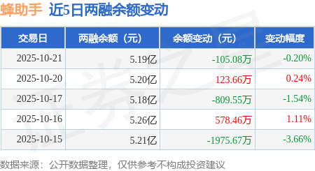 证券之星消息,10月21日,蜂助手(301382)融资买入1759.42万元,融资偿还1864.5万元,融资净卖出105.08万元,融资余额5.19亿元。