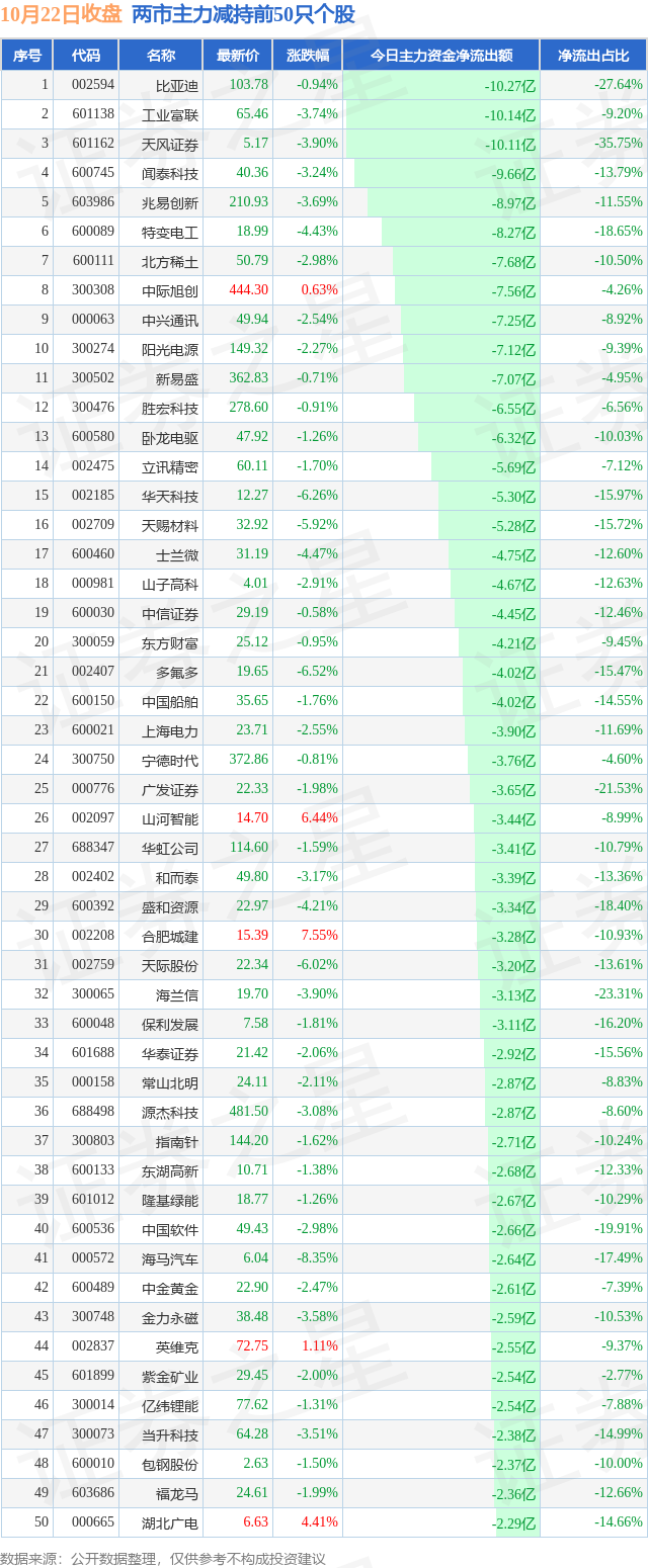 两市主力减持最多的前十只个股为: