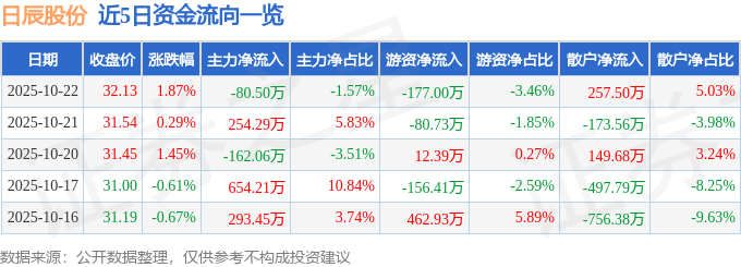 证券之星消息,截至2025年10月22日收盘,日辰股份(603755)报收于32.13元,上涨1.87%,换手率1.64%,成交量1.61万手,成交额5115.92万元。