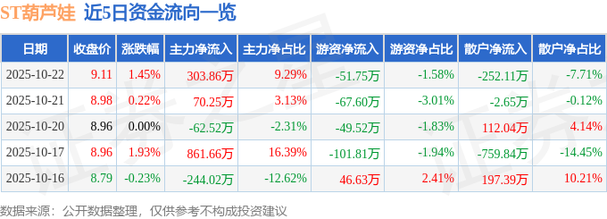 证券之星消息,截至2025年10月22日收盘,ST葫芦娃(605199)报收于9.11元,上涨1.45%,换手率0.9%,成交量3.61万手,成交额3270.1万元。