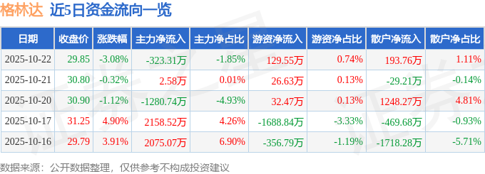 证券之星消息,截至2025年10月22日收盘,格林达(603931)报收于29.85元,下跌3.08%,换手率2.94%,成交量5.86万手,成交额1.75亿元。