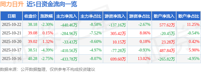 证券之星消息,截至2025年10月22日收盘,同力日升(605286)报收于38.18元,下跌2.3%,换手率0.8%,成交量1.34万手,成交额5132.21万元。