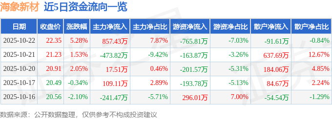 证券之星消息,截至2025年10月22日收盘,海象新材(003011)报收于22.35元,上涨5.28%,换手率6.34%,成交量4.95万手,成交额1.09亿元。