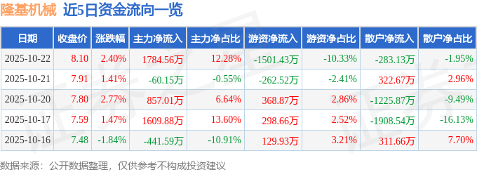 证券之星消息,截至2025年10月22日收盘,隆基机械(002363)报收于8.1元,上涨2.4%,换手率4.37%,成交量18.18万手,成交额1.45亿元。
