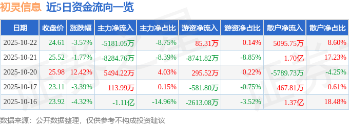 证券之星消息,截至2025年10月22日收盘,初灵信息(300250)报收于24.61元,下跌3.57%,换手率15.2%,成交量23.97万手,成交额5.92亿元。