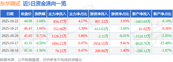 证券之星消息,截至2025年10月22日收盘,东华测试(300354)报收于44.98元,下跌3.08%,换手率5.58%,成交量4.54万手,成交额2.05亿元。