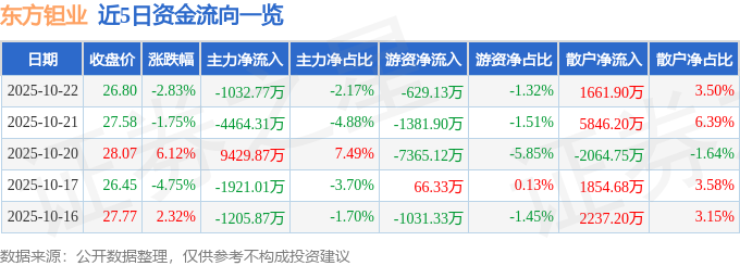 证券之星消息,截至2025年10月22日收盘,东方钽业(000962)报收于26.8元,下跌2.83%,换手率3.5%,成交量17.57万手,成交额4.75亿元。