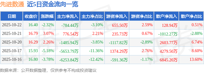证券之星消息,截至2025年10月22日收盘,先进数通(300541)报收于16.4元,下跌2.32%,换手率3.97%,成交量15.33万手,成交额2.53亿元。
