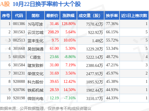 当日A股换手率前10大个股中8只个股收涨,平均涨幅23.43%,其中N马可波(001386)以换手率77.36%排第一,6只个股近5个交易日中多次上榜。