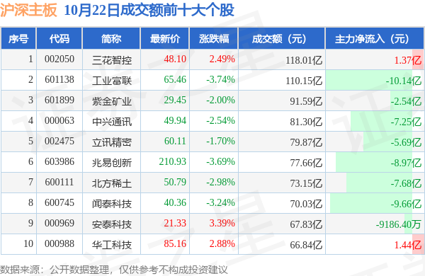 当日沪深主板成交额前10大个股中3只个股收涨,平均涨幅2.92%,其中三花智控(002050)以成交额118.01亿元排第一。从主力资金流入看,成交额前10大个股中有2只个股呈现主力资金净流入。
