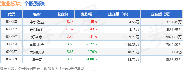 证券之星消息,10月22日渔业板块较上一交易日下跌0.09%,獐子岛领跌。当日上证指数报收于3913.76,下跌0.07%。深证成指报收于12996.61,下跌0.62%。渔业板块个股涨跌见下表: