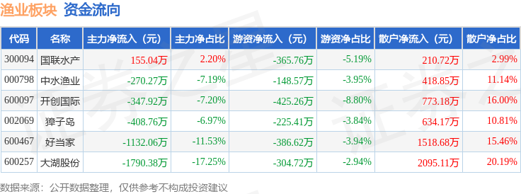 从资金流向上来看,当日渔业板块主力资金净流出3794.35万元,游资资金净流出1856.35万元,散户资金净流入5650.7万元。渔业板块个股资金流向见下表: