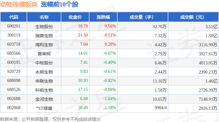 证券之星消息,10月22日动物保健板块较上一交易日下跌0.36%,大禹生物领跌。当日上证指数报收于3913.76,下跌0.07%。深证成指报收于12996.61,下跌0.62%。动物保健板块个股涨跌见下表: