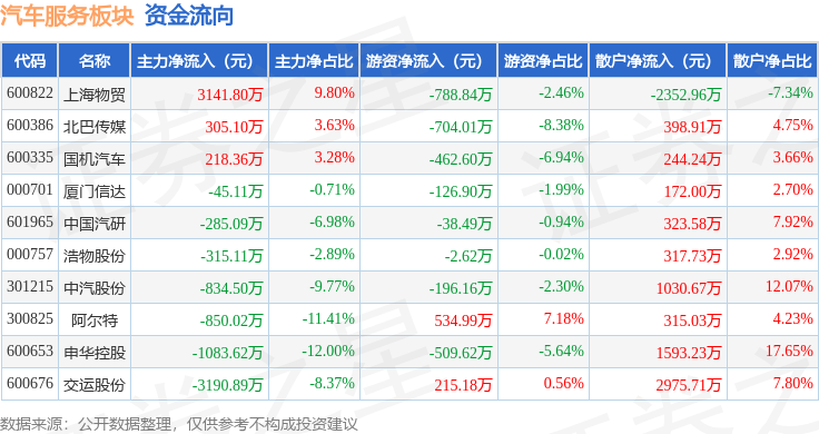 从资金流向上来看,当日汽车服务板块主力资金净流出2939.09万元,游资资金净流出2079.06万元,散户资金净流入5018.15万元。汽车服务板块个股资金流向见下表: