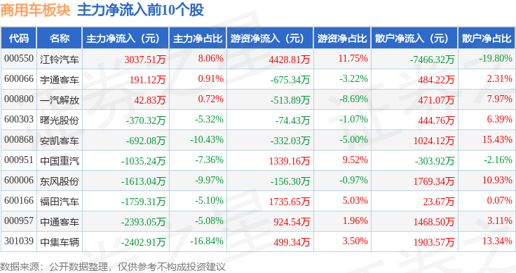 从资金流向上来看,当日商用车板块主力资金净流出2.43亿元,游资资金净流入1.25亿元,散户资金净流入1.19亿元。商用车板块个股资金流向见下表: