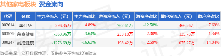 从资金流向上来看,当日其他家电板块主力资金净流出1346.31万元,游资资金净流出331.0万元,散户资金净流入1677.31万元。其他家电板块个股资金流向见下表: