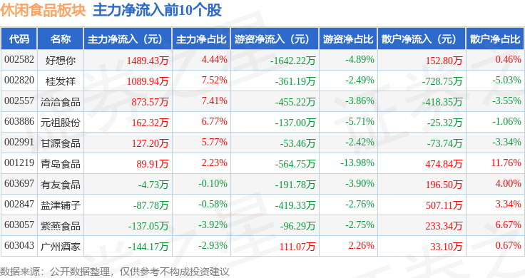 从资金流向上来看,当日休闲食品板块主力资金净流出1.57亿元,游资资金净流入5310.08万元,散户资金净流入1.04亿元。休闲食品板块个股资金流向见下表: