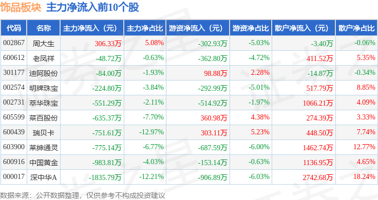 从资金流向上来看,当日饰品板块主力资金净流出2.63亿元,游资资金净流入3710.44万元,散户资金净流入2.26亿元。饰品板块个股资金流向见下表: