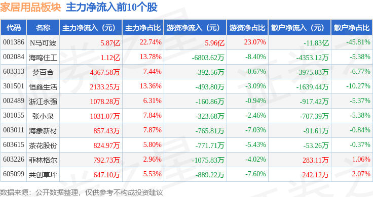 从资金流向上来看,当日家居用品板块主力资金净流入6.02亿元,游资资金净流入4.75亿元,散户资金净流出10.77亿元。家居用品板块个股资金流向见下表: