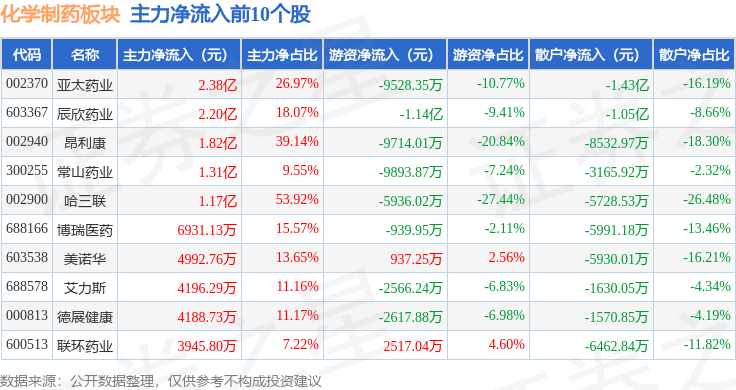 从资金流向上来看,当日化学制药板块主力资金净流入1.85亿元,游资资金净流出2.27亿元,散户资金净流入4140.47万元。化学制药板块个股资金流向见下表: