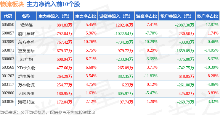 从资金流向上来看,当日物流板块主力资金净流出3.77亿元,游资资金净流入7819.08万元,散户资金净流入2.99亿元。物流板块个股资金流向见下表: