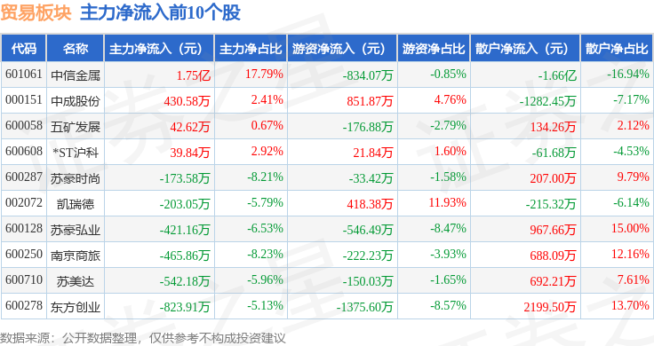 从资金流向上来看,当日贸易板块主力资金净流入9681.12万元,游资资金净流出1607.33万元,散户资金净流出8073.78万元。贸易板块个股资金流向见下表: