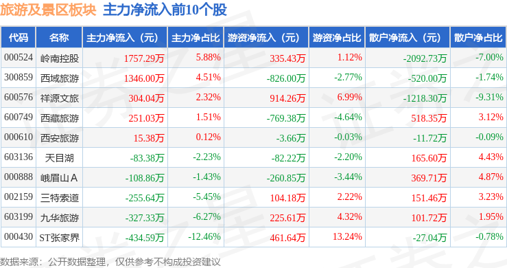 从资金流向上来看,当日旅游及景区板块主力资金净流出2.66亿元,游资资金净流入263.09万元,散户资金净流入2.64亿元。旅游及景区板块个股资金流向见下表: