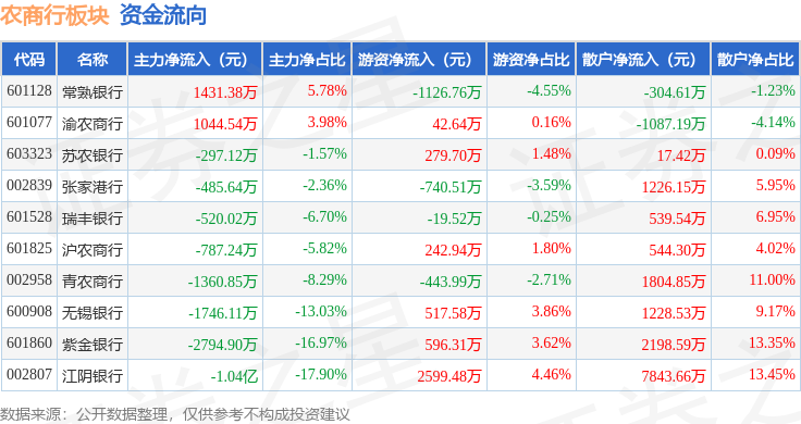 从资金流向上来看,当日农商行板块主力资金净流出1.6亿元,游资资金净流入1947.87万元,散户资金净流入1.4亿元。农商行板块个股资金流向见下表: