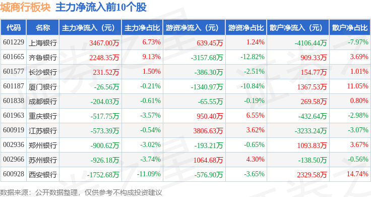 从资金流向上来看,当日城商行板块主力资金净流出2.69亿元,游资资金净流入1.04亿元,散户资金净流入1.65亿元。城商行板块个股资金流向见下表: