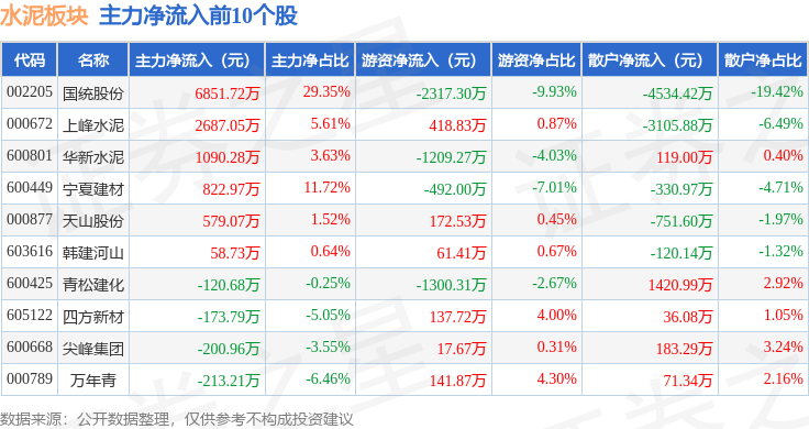 从资金流向上来看,当日水泥板块主力资金净流入577.39万元,游资资金净流出5224.2万元,散户资金净流入4646.82万元。水泥板块个股资金流向见下表: