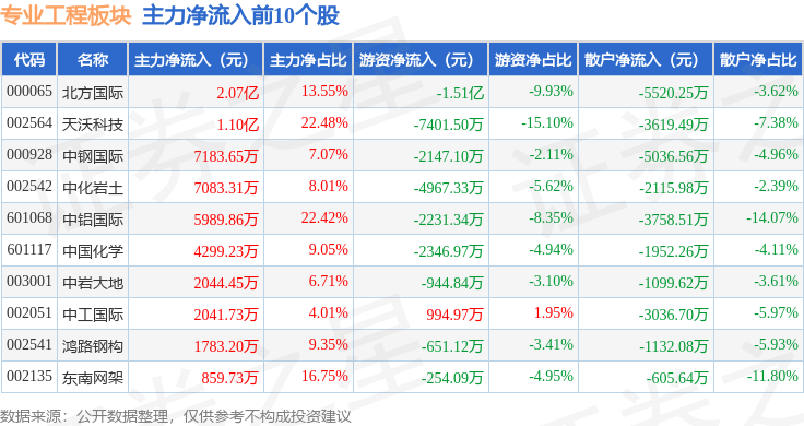 从资金流向上来看,当日专业工程板块主力资金净流入4.13亿元,游资资金净流出4.06亿元,散户资金净流出742.62万元。专业工程板块个股资金流向见下表:
