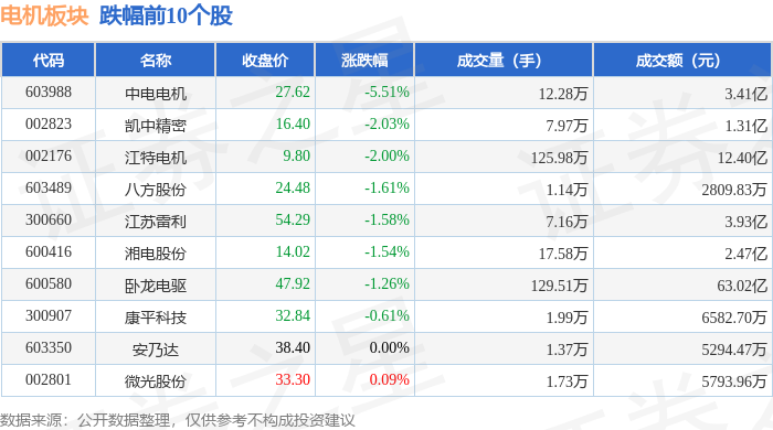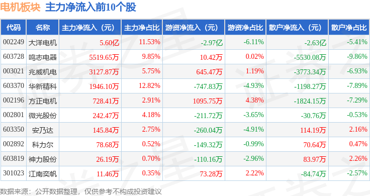 从资金流向上来看,当日电机板块主力资金净流出7999.89万元,游资资金净流出7997.45万元,散户资金净流入1.6亿元。电机板块个股资金流向见下表: