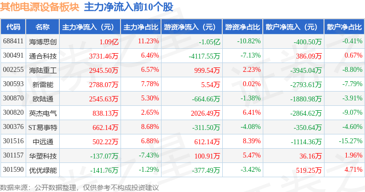 从资金流向上来看,当日其他电源设备板块主力资金净流出3.26亿元,游资资金净流出8951.51万元,散户资金净流入4.16亿元。其他电源设备板块个股资金流向见下表:
