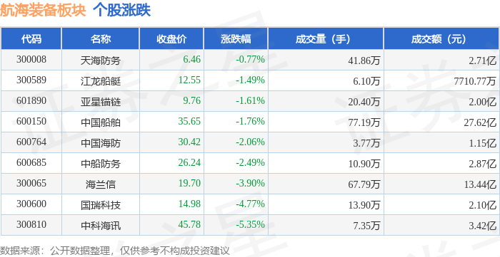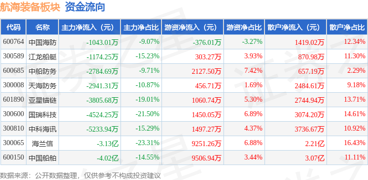 从资金流向上来看,当日航海装备板块主力资金净流出9.3亿元,游资资金净流入2.53亿元,散户资金净流入6.77亿元。航海装备板块个股资金流向见下表: