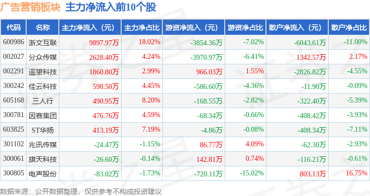 从资金流向上来看,当日广告营销板块主力资金净流出1450.06万元,游资资金净流出1296.63万元,散户资金净流入2746.69万元。广告营销板块个股资金流向见下表: