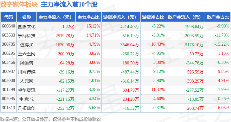 从资金流向上来看,当日数字媒体板块主力资金净流出1.58亿元,游资资金净流出4690.84万元,散户资金净流入2.05亿元。数字媒体板块个股资金流向见下表: