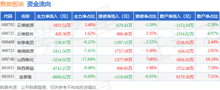 从资金流向上来看,当日焦炭板块主力资金净流出1.63亿元,游资资金净流入1826.22万元,散户资金净流入1.45亿元。焦炭板块个股资金流向见下表: