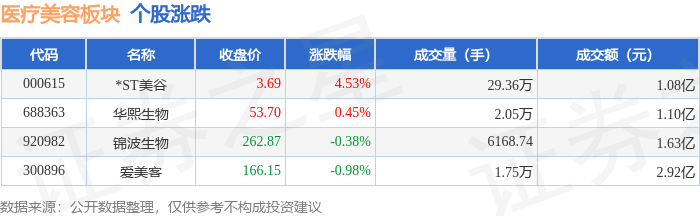 证券之星消息,10月22日医疗美容板块较上一交易日下跌0.17%,爱美客领跌。当日上证指数报收于3913.76,下跌0.07%。深证成指报收于12996.61,下跌0.62%。医疗美容板块个股涨跌见下表: