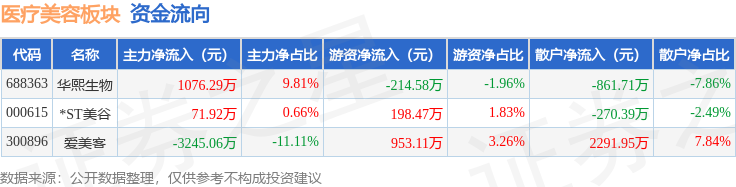 从资金流向上来看,当日医疗美容板块主力资金净流出2096.85万元,游资资金净流入937.0万元,散户资金净流入1159.85万元。医疗美容板块个股资金流向见下表: