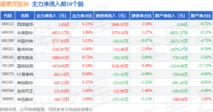 从资金流向上来看,当日磁悬浮板块主力资金净流出7.5亿元,游资资金净流入3.23亿元,散户资金净流入4.27亿元。磁悬浮板块个股资金流向见下表: