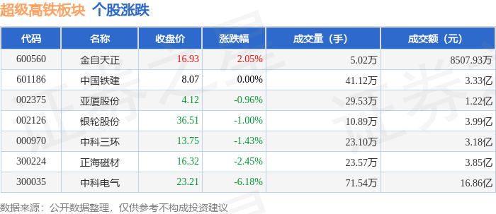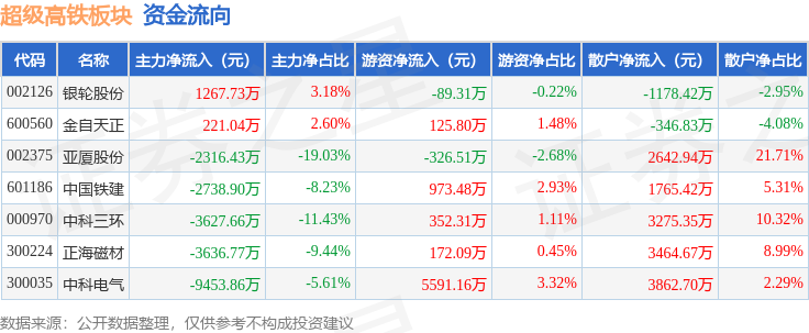 从资金流向上来看,当日超级高铁板块主力资金净流出2.03亿元,游资资金净流入6799.02万元,散户资金净流入1.35亿元。超级高铁板块个股资金流向见下表: