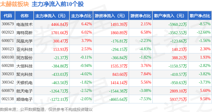 从资金流向上来看,当日太赫兹板块主力资金净流出2.77亿元,游资资金净流入6978.34万元,散户资金净流入2.07亿元。太赫兹板块个股资金流向见下表: