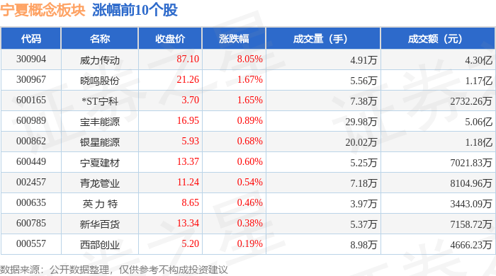 证券之星消息,10月22日宁夏概念板块较上一交易日上涨0.41%,威力传动领涨。当日上证指数报收于3913.76,下跌0.07%。深证成指报收于12996.61,下跌0.62%。宁夏概念板块个股涨跌见下表: