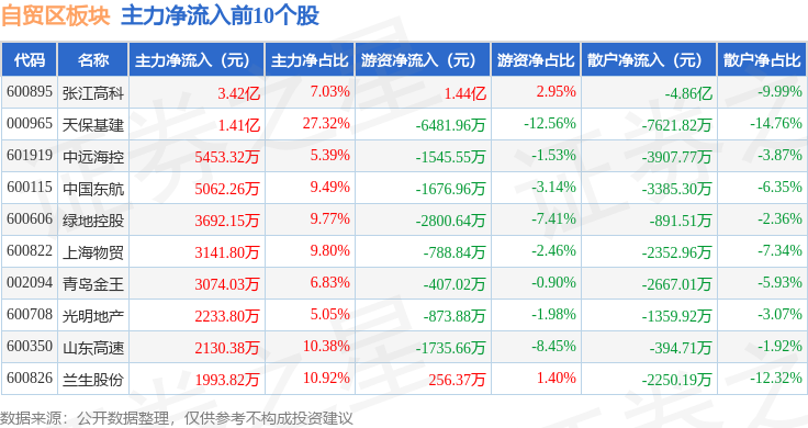 从资金流向上来看,当日自贸区板块主力资金净流出18.69亿元,游资资金净流入2.9亿元,散户资金净流入15.79亿元。自贸区板块个股资金流向见下表: