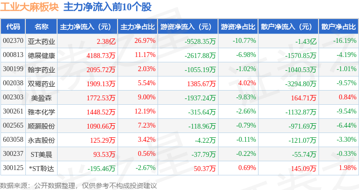 从资金流向上来看,当日工业大麻板块主力资金净流入1.24亿元,游资资金净流出1.12亿元,散户资金净流出1217.27万元。工业大麻板块个股资金流向见下表: