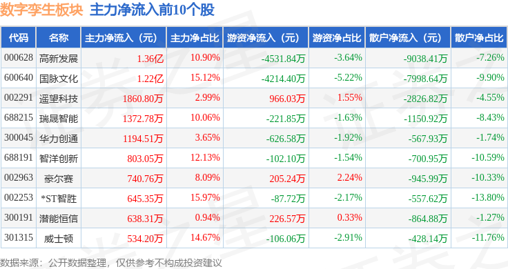 从资金流向上来看,当日数字孪生板块主力资金净流出2.7亿元,游资资金净流入1.12亿元,散户资金净流入1.58亿元。数字孪生板块个股资金流向见下表: