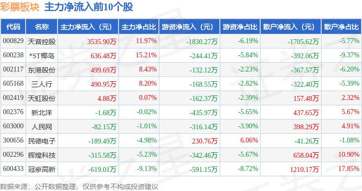 从资金流向上来看,当日彩票板块主力资金净流出2.89亿元,游资资金净流入2511.94万元,散户资金净流入2.64亿元。彩票板块个股资金流向见下表: