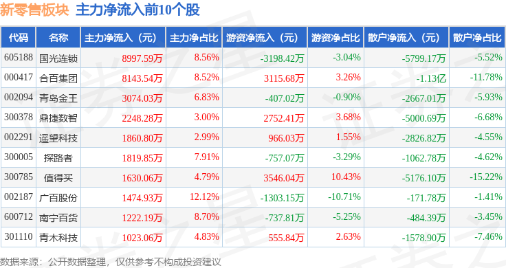 从资金流向上来看,当日新零售板块主力资金净流出4.79亿元,游资资金净流入6978.86万元,散户资金净流入4.09亿元。新零售板块个股资金流向见下表:
