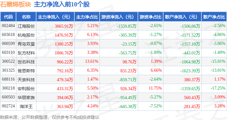 从资金流向上来看,当日石墨烯板块主力资金净流出18.99亿元,游资资金净流入2.18亿元,散户资金净流入16.81亿元。石墨烯板块个股资金流向见下表: