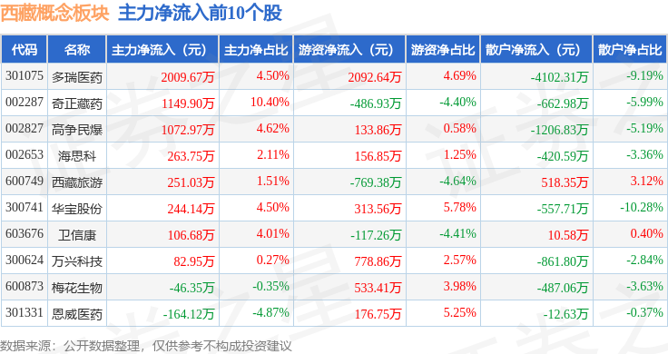 从资金流向上来看,当日西藏概念板块主力资金净流出3.45亿元,游资资金净流入1.14亿元,散户资金净流入2.31亿元。西藏概念板块个股资金流向见下表: